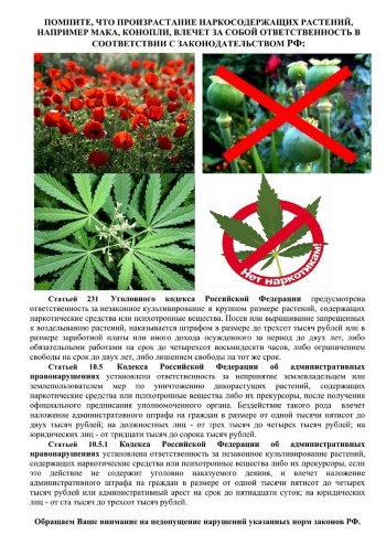 Полицейские призывают граждан, которым известно о фактах искусственного культивирования мака или конопли, а также о лицах, причастных к незаконному обороту наркотических средств, сообщать о данных фактах в органы внутренних дел.